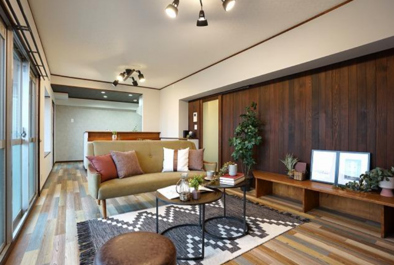 クロス張替、LD壁漆喰塗装、室内フロアタイル仕上げ、デスク設置(北東洋室)、コンロ・キッチン水栓・トイレ・給湯器交換、キッチン・浴室コーティング施工、建具木部塗装・金具交換、ハウスクリーニング等のリフォーム物件